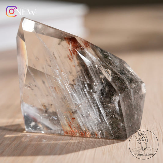 White rabbit hair quartz freeform with grey-red phantom