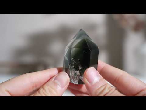 Half-polished multi-layered red-green phantom quartz point