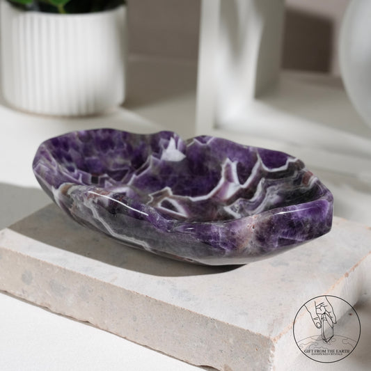 夢幻紫水晶,又稱為Chevron Amethyst,是一種獨特的紫水晶品種,其名字來自於白色和紫色的條紋,條紋往往呈現「V」字或「箭形」形,像是一種夢幻般的形態。