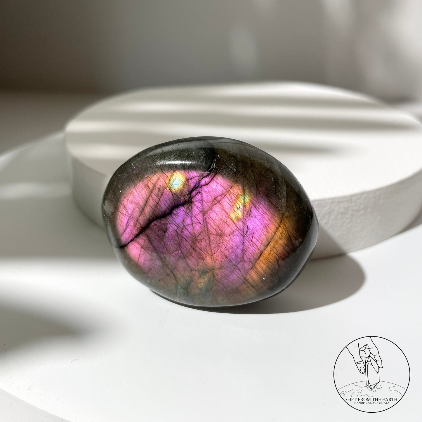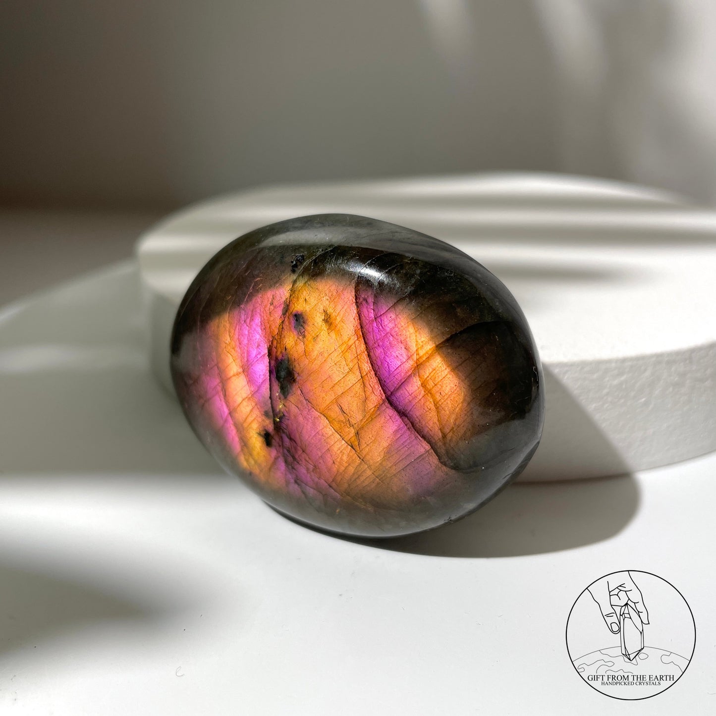 拉長石主要成份是鈉長石及鈣長石。鈣長石會形成一格格定向排列的空隙,而具有反光特質的鈉長石晶體會填補鈣長石形成的空隙。因此在光的照射下,拉長石會在不同的角度折射出不同的色彩,折射出的光彩完全是在大自然中隨機形成。©️GFE