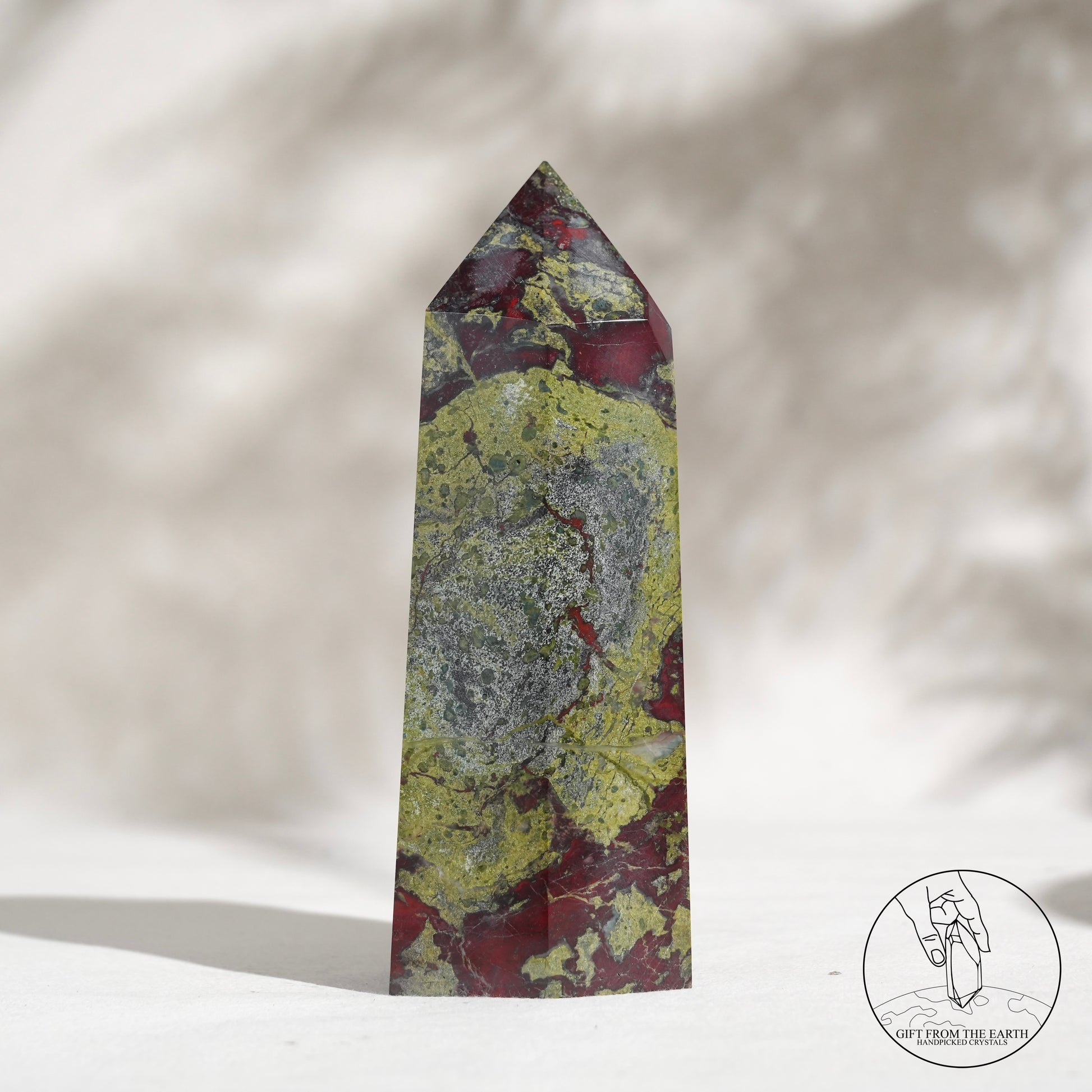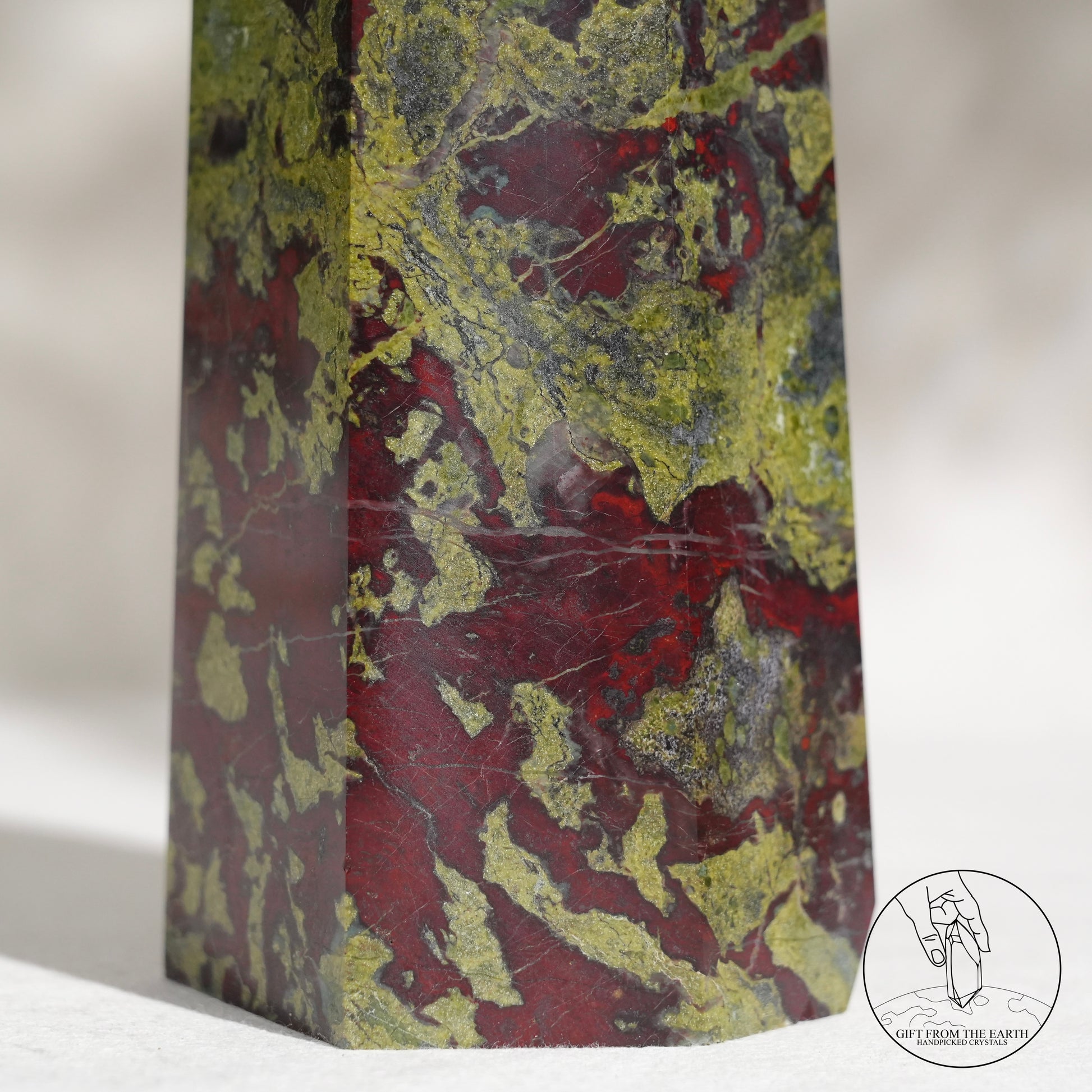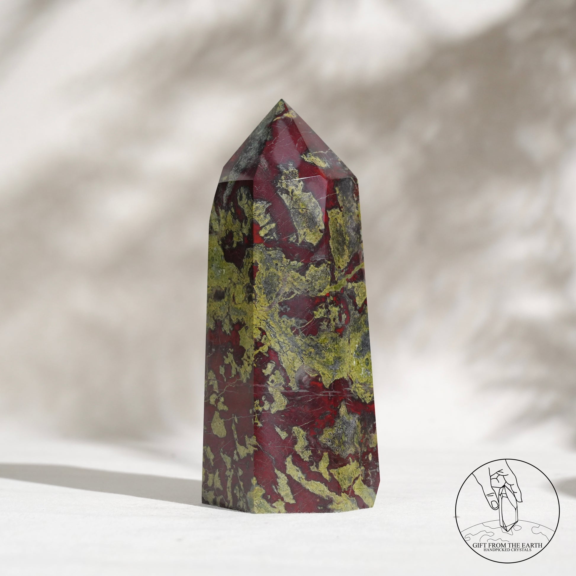 Dragon's Blood Jasper 是一種來自西澳大利亞的獨特的半寶石,強烈的紅色斑點與暗綠色背景相結合,讓古人聯想到像龍的血滴在石頭上,以這個意象命名。龍血碧玉在很多文化中都是被受到高度尊重的一種礦石,原因是象徵着「龍血」,具有龍的保護及力量的意思。而血亦都象徵着勇氣,因此很多古時的戰士都會佩戴龍血石的配飾,象徵着克服挑戰及祝福。