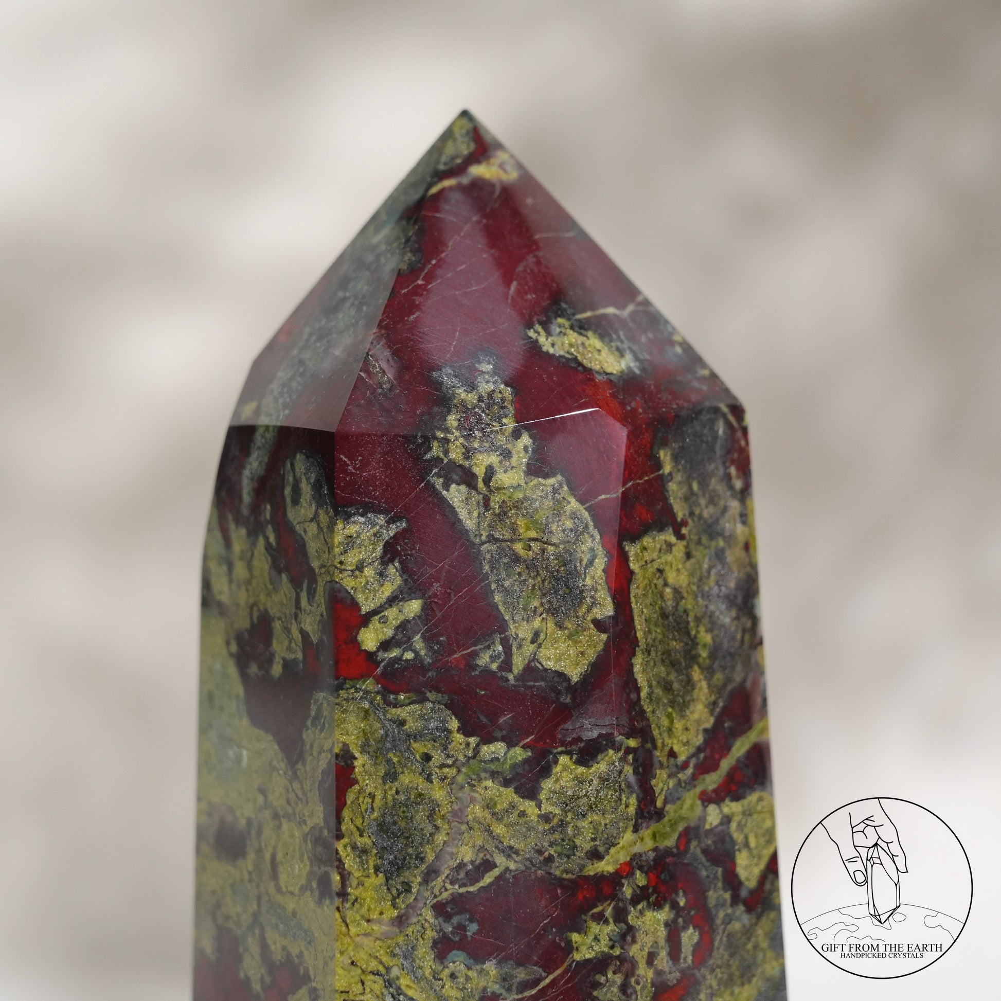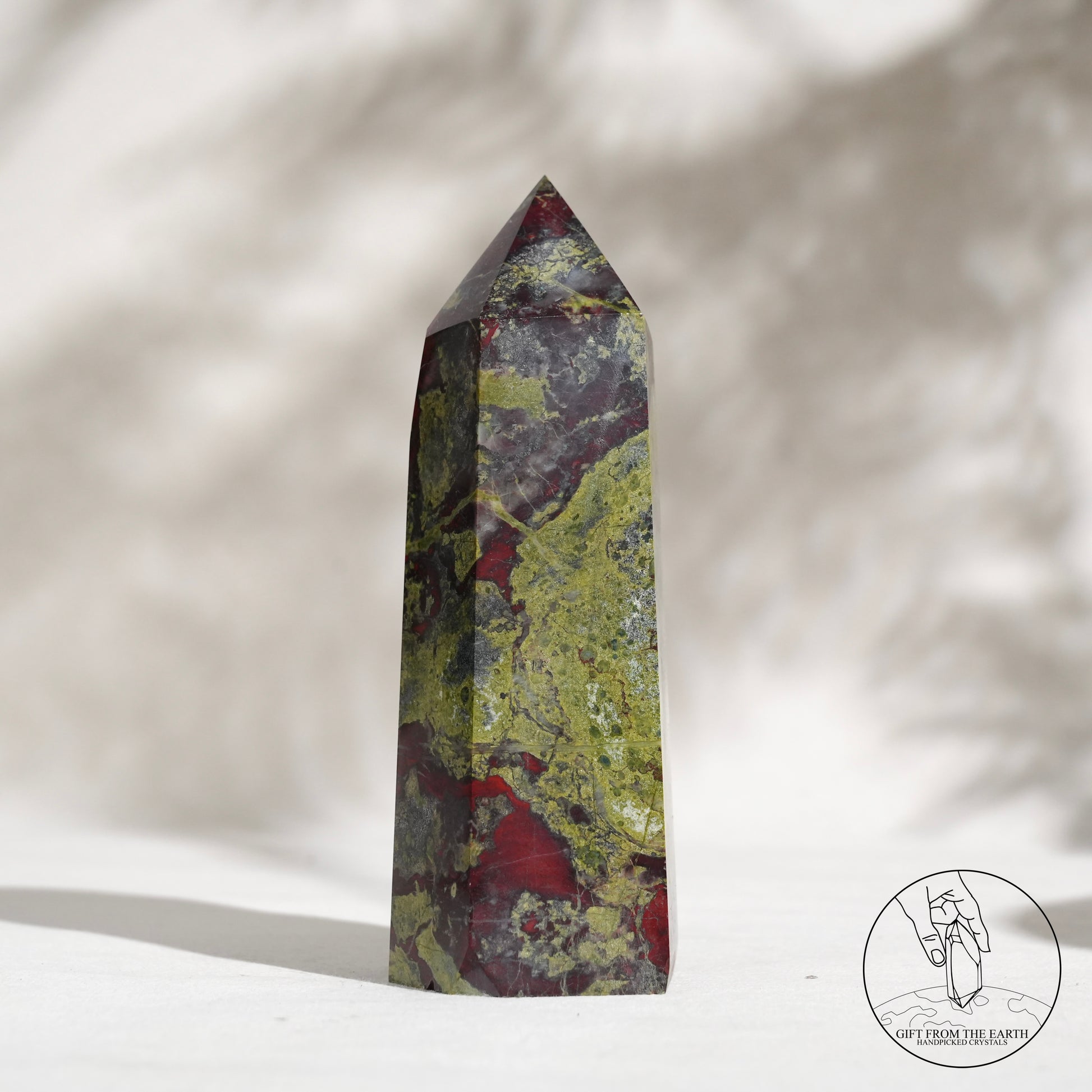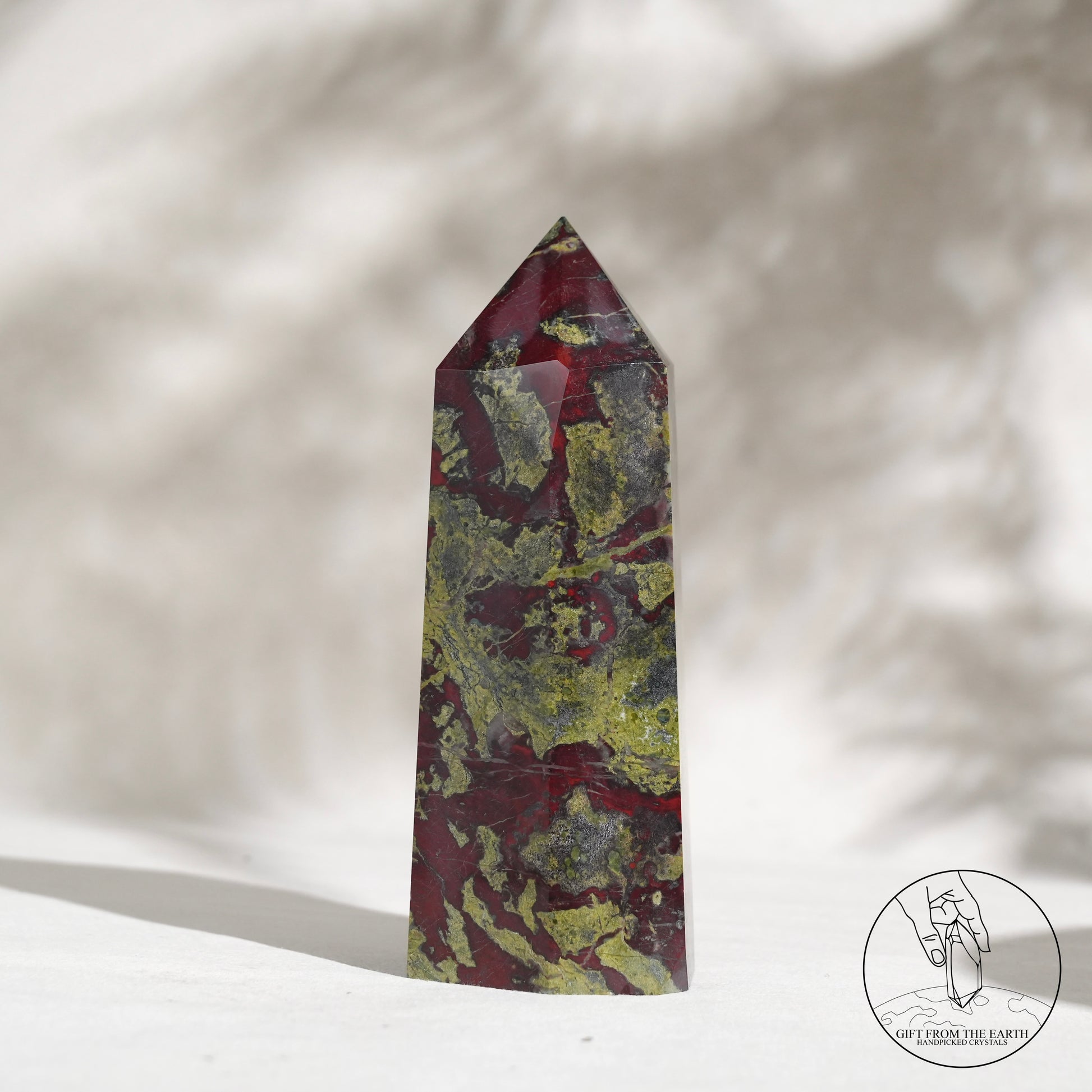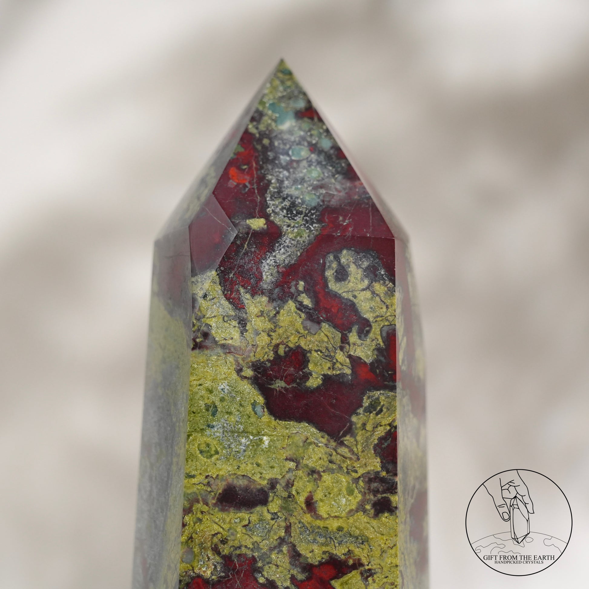 Dragon's Blood Jasper 是一種來自西澳大利亞的獨特的半寶石,強烈的紅色斑點與暗綠色背景相結合,讓古人聯想到像龍的血滴在石頭上,以這個意象命名。龍血碧玉在很多文化中都是被受到高度尊重的一種礦石,原因是象徵着「龍血」,具有龍的保護及力量的意思。而血亦都象徵着勇氣,因此很多古時的戰士都會佩戴龍血石的配飾,象徵着克服挑戰及祝福。